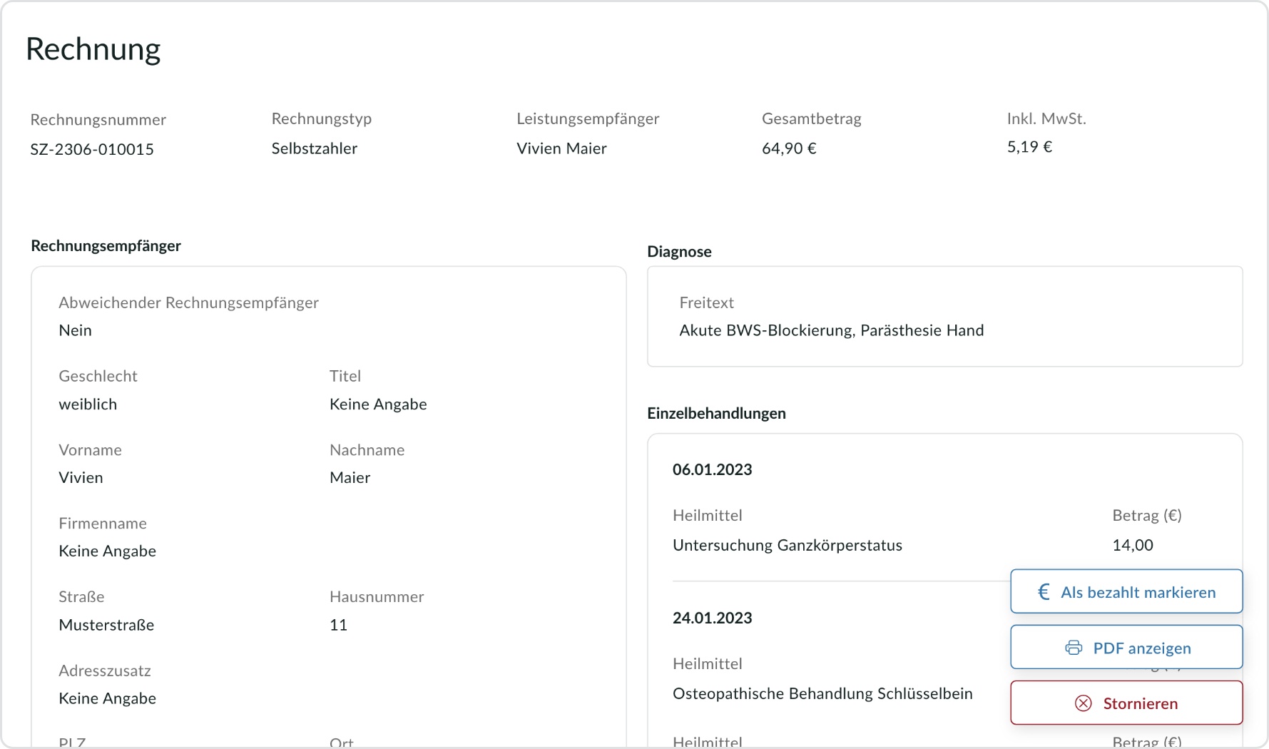 Dank der übersichtlichen Darstellung behältst du den Überblick über alle durchgeführten Behandlungen, die anfallenden Kosten und etwaige Ausfallgebühren. So kannst du die Rechnungsstellung schnell und präzise abwickeln, ohne wertvollen Zeitverlust.