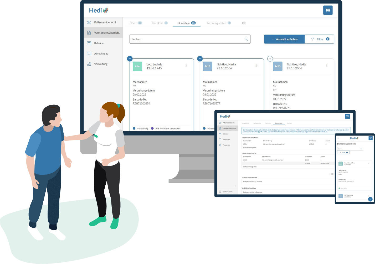 Mit Hedi vereinfachst du deine Praxisverwaltung und schaffst Raum für eine erstklassige Patientenbetreuung. Unsere Software ist bewusst auf das Nötigste reduziert, um dir eine intuitive und effiziente Arbeitsweise zu ermöglichen. Die Möglichkeit zur Abrechnung ist inklusive.